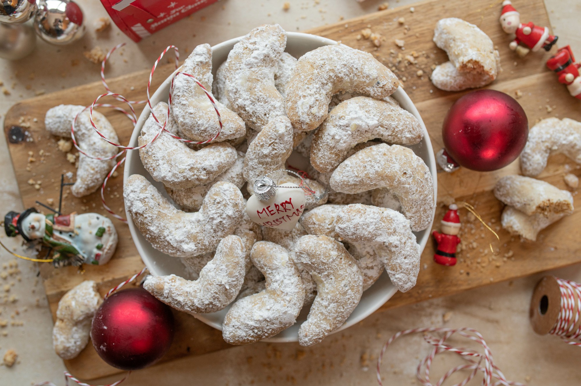 Growing up, my aunt would make a big batch of these cookies every Christmas and store them in a large tin. They were everyone's favorite, and that tin would empty fast! These buttery cookies, with a hint of almond, are rolled in powdered sugar while still warm, giving them the perfect soft sweetness. Similar to Butter Balls or Mexican Wedding Cookies, these originated in Germany and are shaped into delicate crescents. This recipe makes plenty—perfect for sharing with family or gifting to friends!