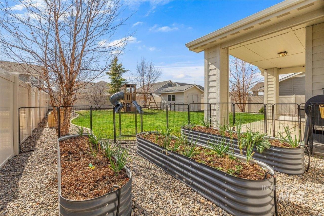 With curb appeal and a charming backyard garden, this home is the ultimate pick within The Oaks North community. Upgraded and spotless, you wont find a stitch of carpet here. EVP flooring, vaulted ceilings, solid core doors, blackout blinds, upgraded cabinetry, a reverse osmosis system and more set this home apart from the others. Spend this summer enjoying The Oaks resort style pool, the pickleball courts and community parks or stay at home relaxing in the backyard. Thoughtful details like a fenced garden bed area, functional matching storage shed, an oversized covered patio, lush grass and added trees make it the perfect place to be. Located just minutes from everything North Meridian has to offer from dining to shopping, its all here. Move around the valley quickly with easy access to both I-84, Chinden Blvd and Hwy 16, youll love living here!